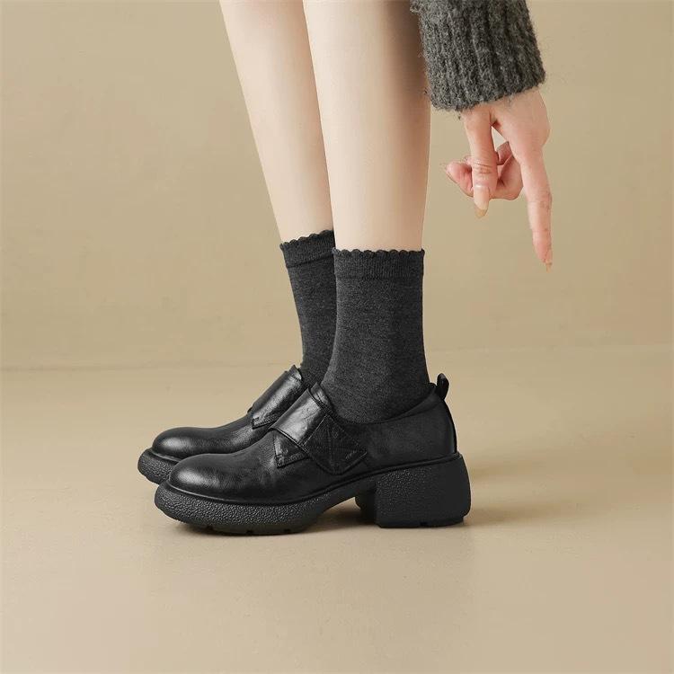 Thick-soled round head retro simple loafers women's Velcro autumn new commuter thick heel comfortable deep mouth single shoes women
