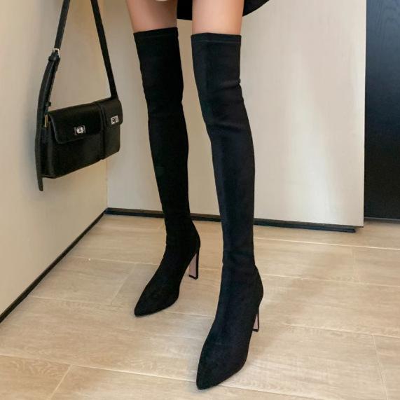 Spetsiga över-knä-stövlar med höga klackar, smala klackar, höst- och vintermode, enastående nisch, elastiska, tjockklackade, stora storlekar, långa damstövlar