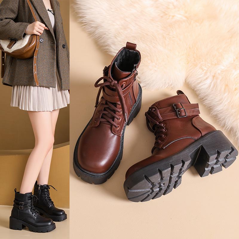 Dam-Martin-kängor med tjock sula och rund tå, tunna sammetskorta stövlar med bältesspänne, 2025 höst och vinter, ny sidodragkedja, utrikeshandel, stor storlek, läder