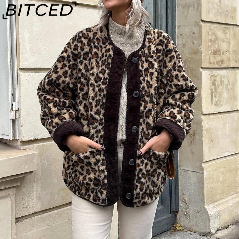 BITCED Women's Autumn Button-Front Fashion Leopard Print Oversized Shearling Coat