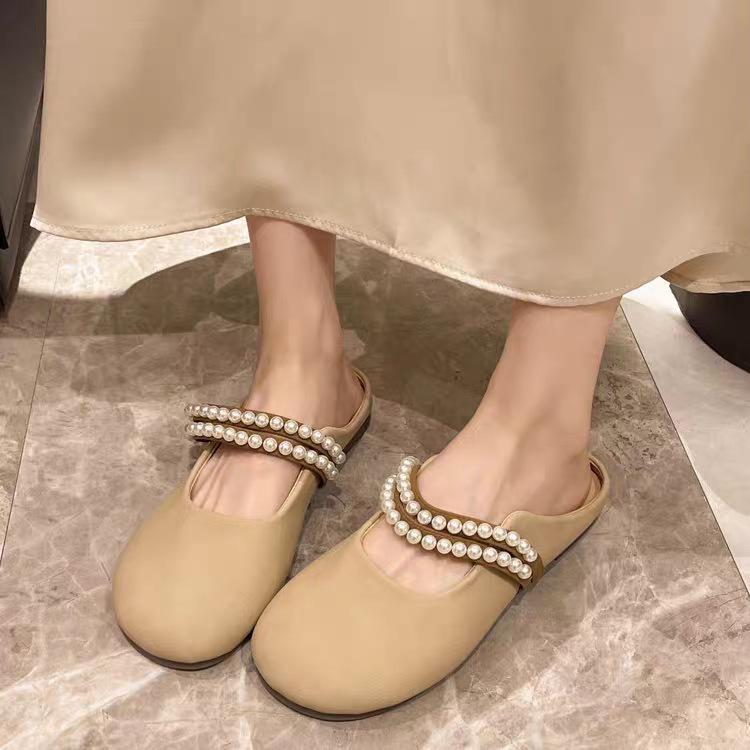 Baotou halvtofflor dam sommar 2025 nya pärlor ett-pedal muller skor platta sandaler lata sandaler