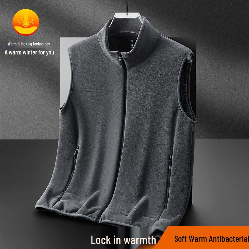 This men's loose-fit vest is designed to provide warmth and style during the autumn and winter seasons. Featuring a sporty look, the vest is crafted with a medium thickness and a solid pattern. It includes a stand-up collar for added protection against the cold, and its zipper closure ensures convenient wear. The outer layer is made from a composite of 94.8% polyester fiber and 5.2% spandex, while the fleece-lined inner layer is 100% polyester fiber, offering a cozy feel. Ideal for those seeking a fashionable and versatile outerwear piece.