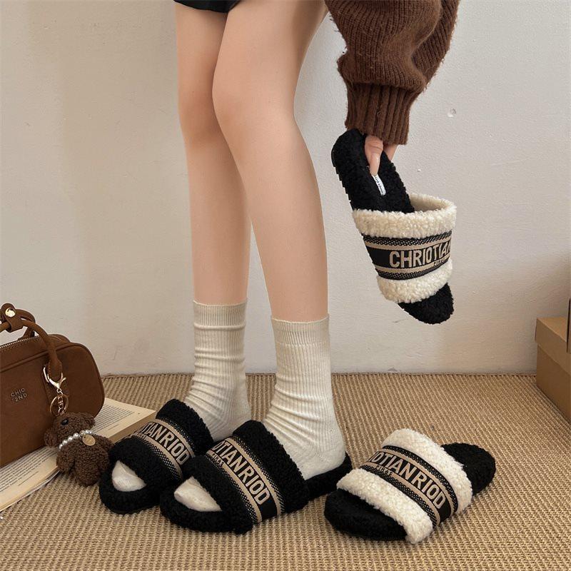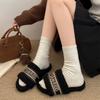 Varma tofflor i bomullsmop, ett ord, fluffiga, damytterplagg, broderi och sammet, platt botten, koreansk version, Xiaoxiangfeng 2025 nya höst och vinter