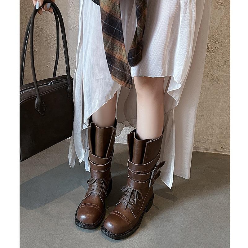 British style lace-up belt buckle thick heel Martin boots women's 2025 new fashion medium tube versatile brown short boots