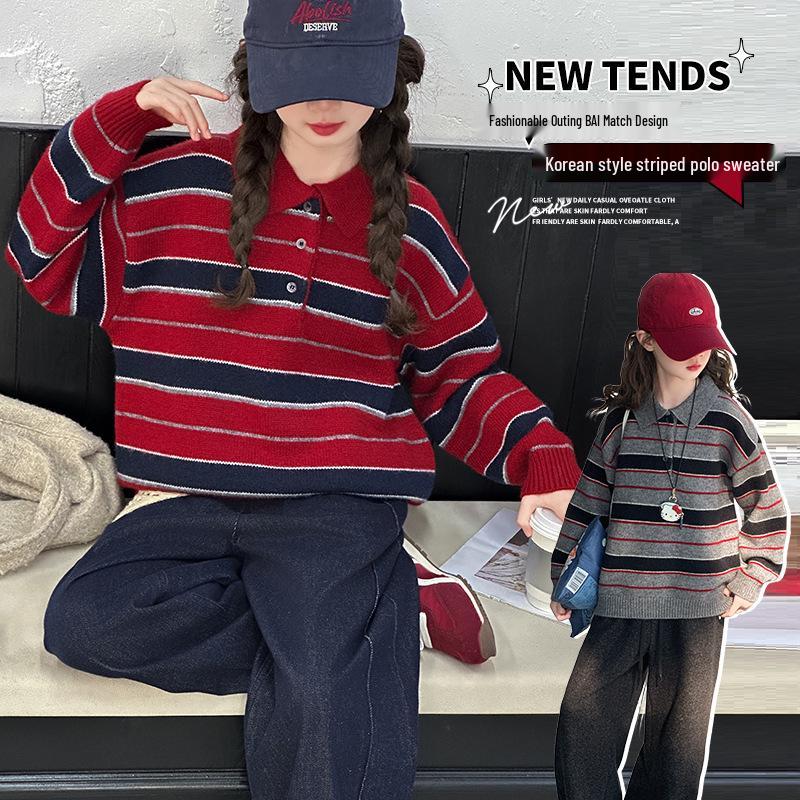 Upptäck det perfekta tillskottet till ditt barns höst- och vintergarderob med denna charmiga randiga stickade polotröja.. Tillverkad av mjuk, andningsbar bomull, den säkerställer komfort och värme under kyliga dagar.. De långa ärmarna ger extra täckning, vilket gör den idealisk för lager-på-lager.. Denna stilfulla tröja kombinerar klassisk polodesign med lekfulla ränder och erbjuder en blandning av elegans och lekfullhet som passar för alla tillfällen.. Perfekt för modeinriktade barn, det lovar att hålla dem mysiga och stiliga hela säsongen.