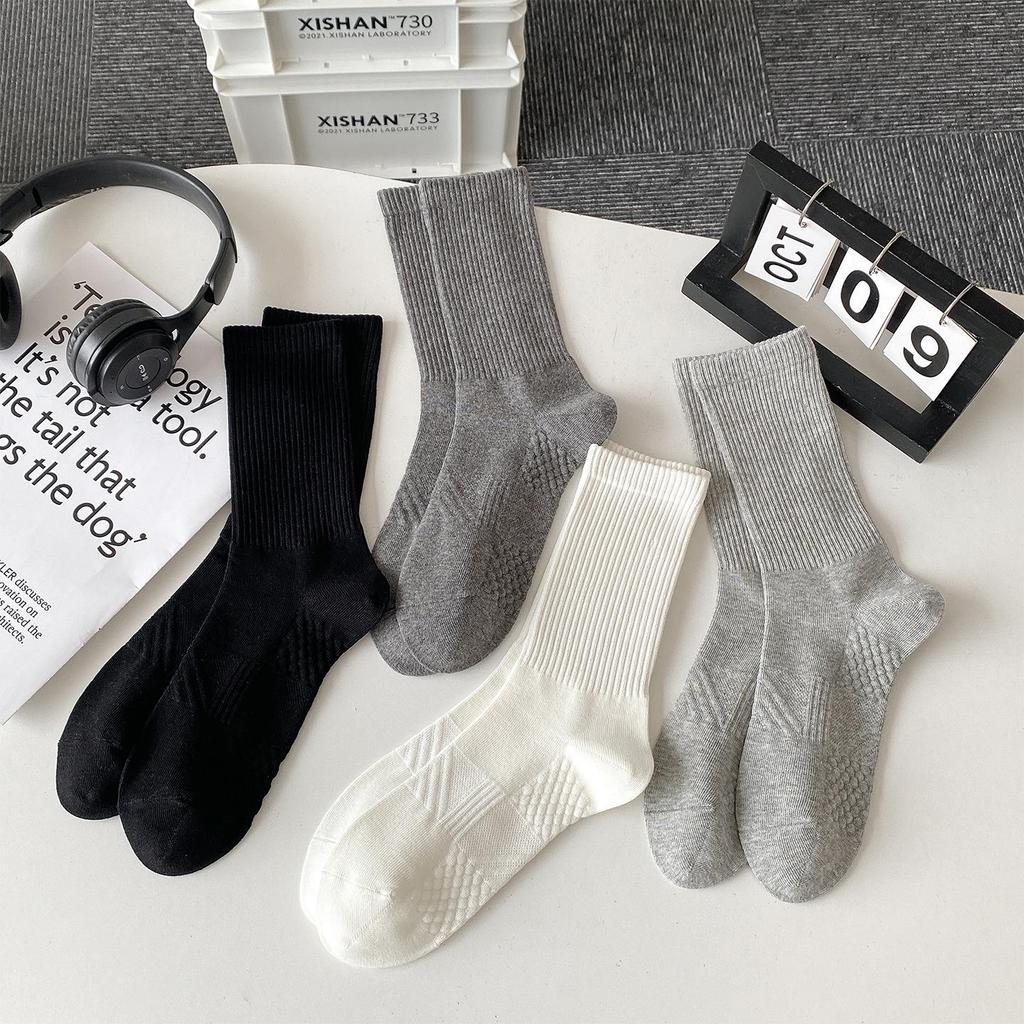 Men's Mid-Calf Cotton Socks, Fall/Winter, Solid Colors, Massage Sole, Breathable, Versatile Sports Style, Black and White.