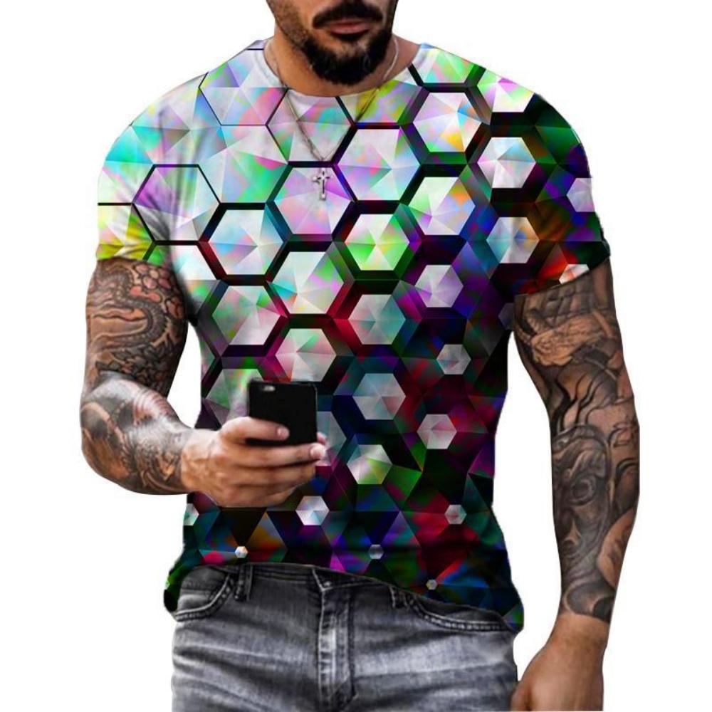 Men's 3D printed T-shirt with geometric printing, summer round neck short sleeved loose casual children's bottom shirt