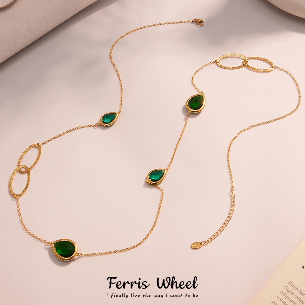 European & American Water Drop Glass Stone Long Sweater Necklace with Hollow Round Ring in Non-Fading Titanium Steel