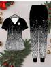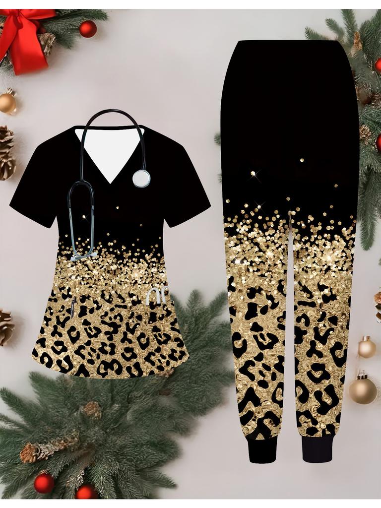 3D Leopard Print Printed Women's Nurse Uniform Set Short Sleeve Long Pants with Pocket Casual Fashionable Christmas Gift