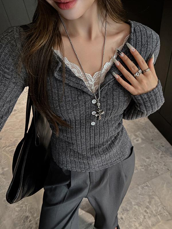 Omfamna de kallare säsongerna med denna eleganta och stilfulla topp för damer, med en smal passform och långa ärmar, perfekt för höst och vinter.. Designad i en sofistikerad koreansk stil, den har en chic V-ringning och en vacker spetslagd detalj som tillför en touch av femininitet till vilken outfit som helst.. Denna stickade topp är tillverkad av högkvalitativ polyester och garanterar både komfort och värme, vilket gör den till ett idealiskt val för lager på kyliga dagar.