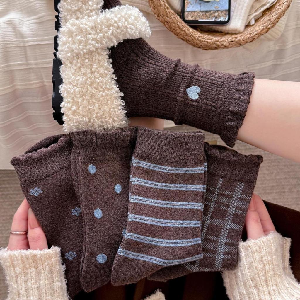 Female Winter Thickened Warm Love Stripe Broken Flowers in The Tube Pile Socks
