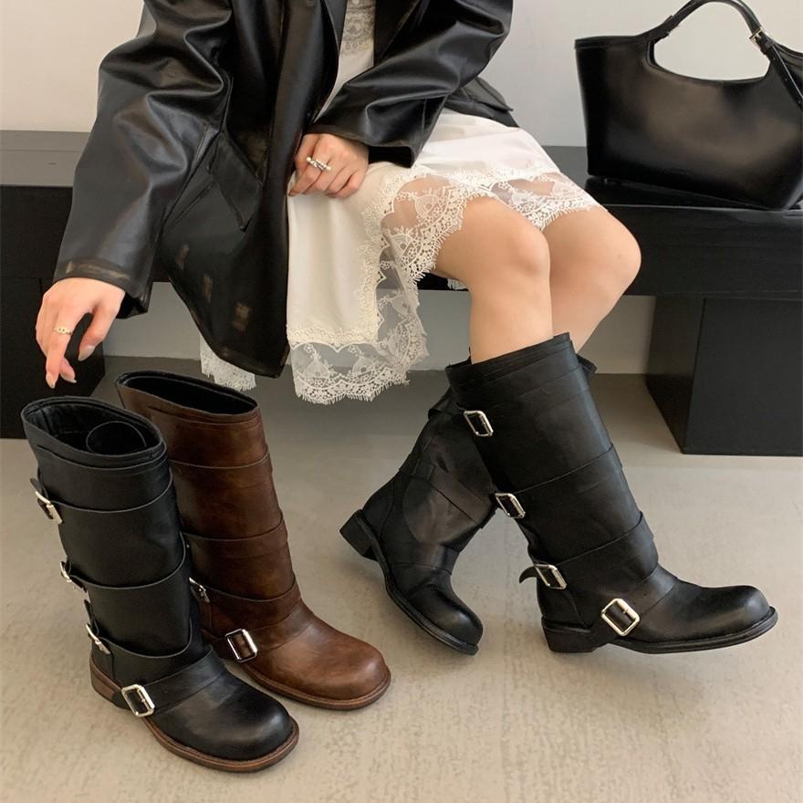 Retro belt buckle boots women's 2025 autumn and winter new thin tall knight boots thick heel large size western cowboy boots