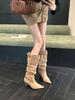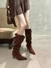Höst och vinter 2025 tunna klackar pile stövlar spetsiga bältesspänne hög klack mocka höga stövlar
