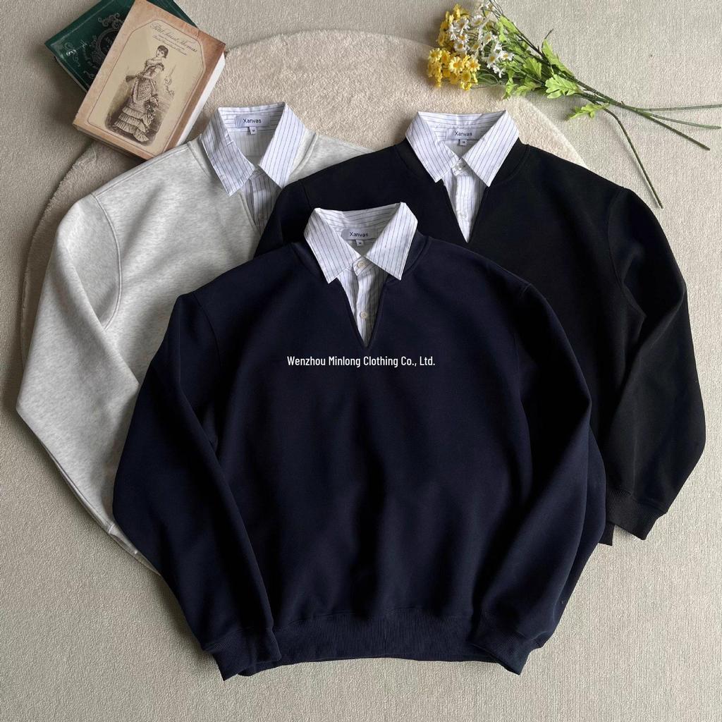 Omfamna en ungdomlig collegevibe med denna stilrena tvådelade sweatshirt designad för män.. Denna ensemble är tillverkad av bekväm bomull och har en distinkt skräddarkrage och ett slående randigt mönster.. De långa ärmarna ger riklig täckning, medan det tunna tyget säkerställer en lätt känsla som är perfekt för lager-på-lager.. Med sin lösa passform erbjuder denna sweatshirt både stil och komfort, vilket gör den till ett mångsidigt tillskott till vilken avslappnad garderob som helst.