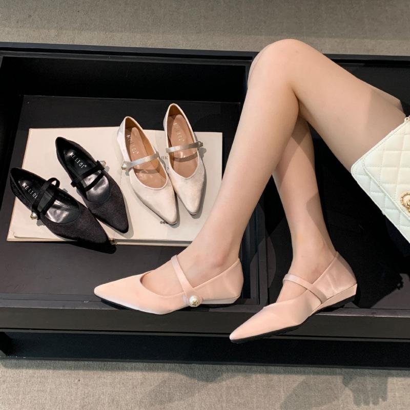 Korean version of pointed-toed flat-bottomed Mary Jane shoes for women in the spring of 2025, the new fairy wind one-pedal shallow-mouth grandma sin