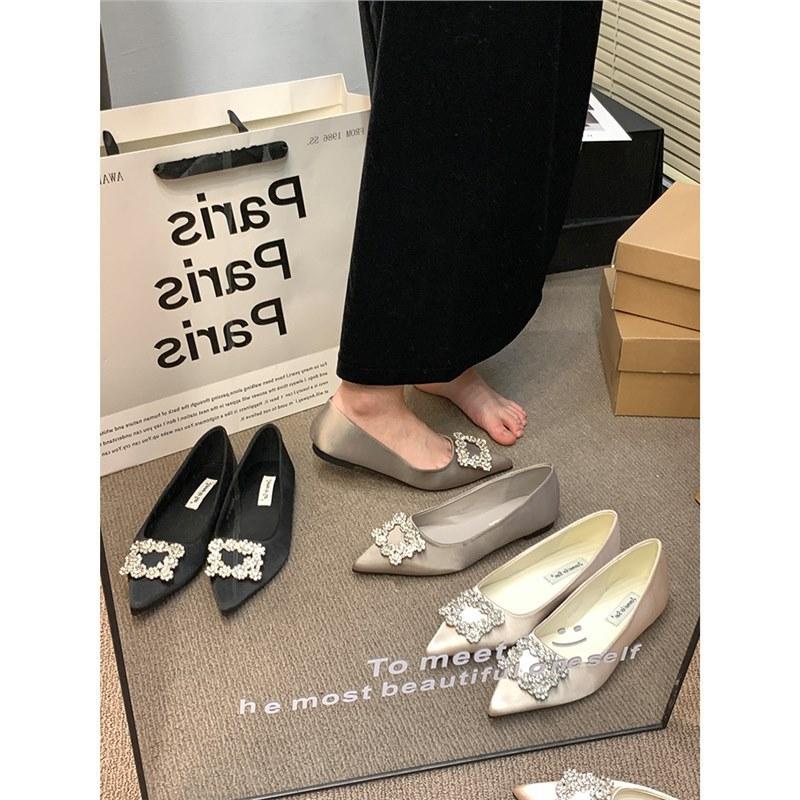 French temperament satin single shoes women's spring pointed rhinestone square buckle with skirt flat bottom ladyshoes
