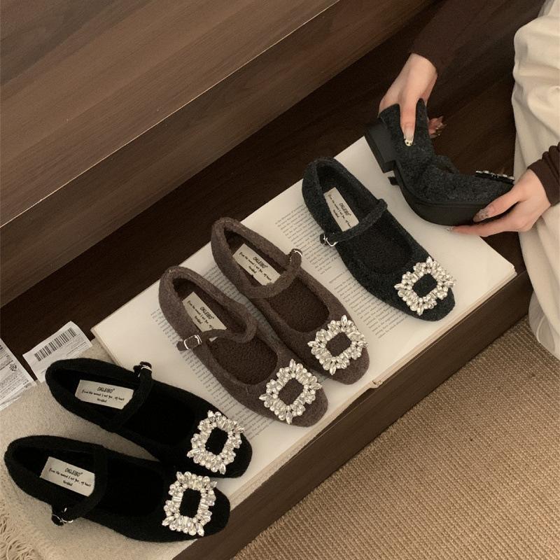 Xiaoxiangfeng woolen rhinestone square head fluffy Mary Jane shoes women's autumn and winter velvet cotton shoes middle heel ladyshoes women's sin