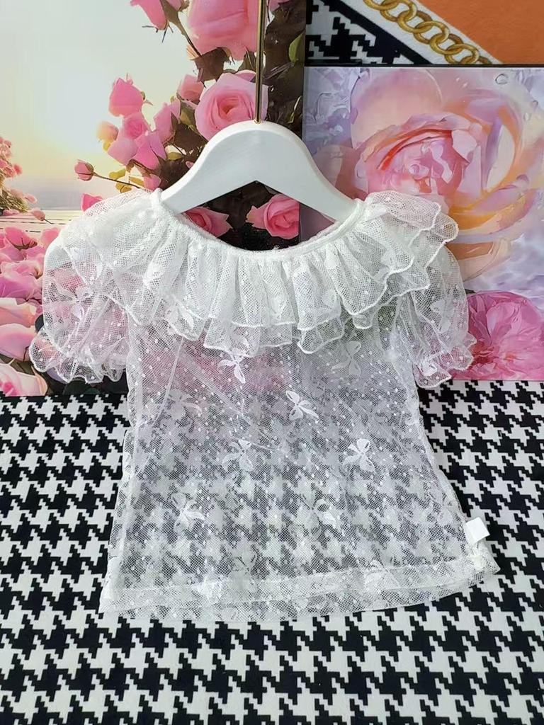 Denna bedårande sommartopp är perfekt för din lilla flicka, med en charmig dubbellagersdesign tillverkad av delikat spets.. Det lätta tyget säkerställer andningsförmåga, vilket gör det idealiskt för varmt väder.. Toppen är designad med korta ärmar, vilket tillför en touch av elegans samtidigt som den tillåter enkel rörelse.. Denna förtjusande pjäs är perfekt för både vardagsutflykter och speciella tillfällen.
