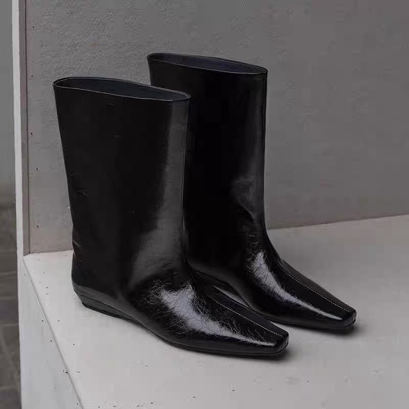 Cowhide version~ Korean niche small square head slope straight mid-tube boots women's 2025 new thin boots Chelsea boots