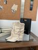 2025 höst och vinter nya spetsiga tjocka högklackade byxstövlar temperament tunna fransk mode medelhöga stövlar damstövlar
