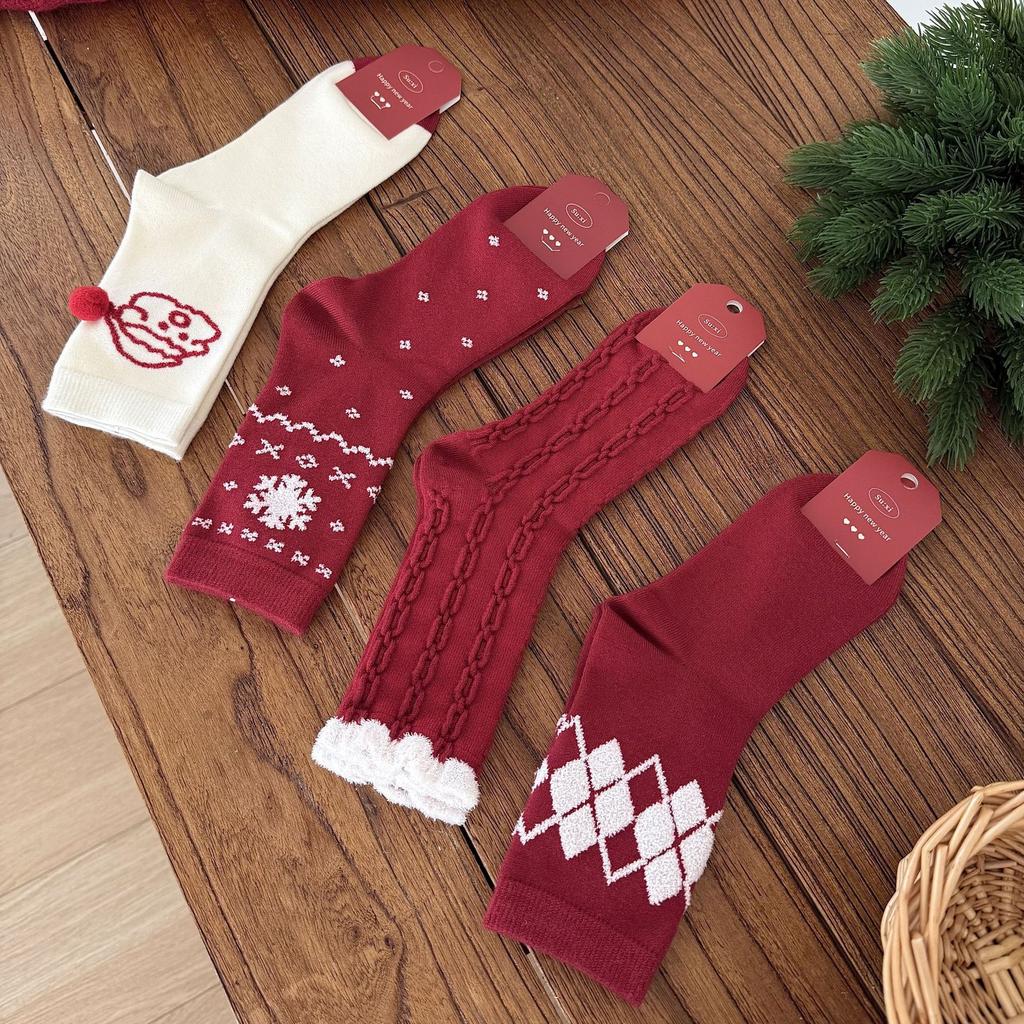 New Year's Festive Red Socks for Women, Autumn and Winter, with Twisted Fleece Balls, Snowflakes, Warm and Comfortable Rabbit Fleece Pile Socks