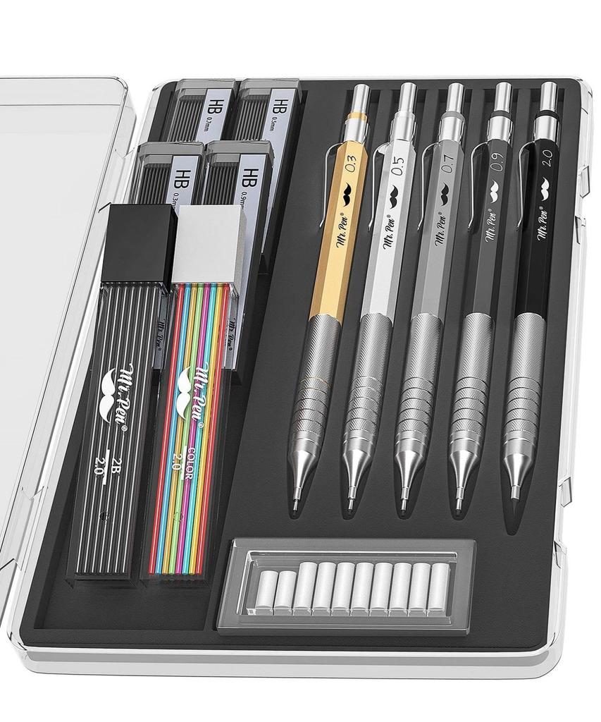Herrn. Penna Metall Mekanisk Pennsats innehåller fem högkvalitativa pennor i fem olika storlekar: 0,3, 0,5, 0,7, 0,9 och 2,0 mm. Den innehåller fem HB-blypåfyllningar av varje storlek, en tub med 2,0 mm färgade blypåfyllningar och tio suddgummi-påfyllningar.. Varje penna har ett bekvämt grepp, vilket möjliggör timmar av bekvämt skrivande.. De mekaniska pennorna är tillverkade av högkvalitativa material.. Kroppen ger en idealisk viktbalans för trötthetsfritt skrivande och ritande.. Vårt mekaniska pennset är idealiskt för skolan eller kontoret.. Det här setet levereras förpackat i en återanvändbar låda med ett lättförslutande lock, vilket håller dina pennor organiserade och skyddade från skador när de inte används. Denne herr. Set med penna och mekanisk penna är perfekt för dagligt bruk. Det är också idealiskt för konst och teknisk teckning.. Lederna är extremt hållbara och brottfasta, vilket gör dem idealiska för konstnärer och yrkesverksamma.. Från arkitekter och konstnärer till studenter, lärare och ingenjörer, denna Herr. Set med penna och mekanisk penna har den perfekta pennan för alla. Fem olika spetsstorlekar gör det enkelt att anpassa till vilket projekt som helst.