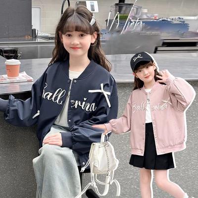 Flickors basebolljackor höst bokstavsbroderi tunn ytterkläder vår uniform rosettknut kappa barnkläder