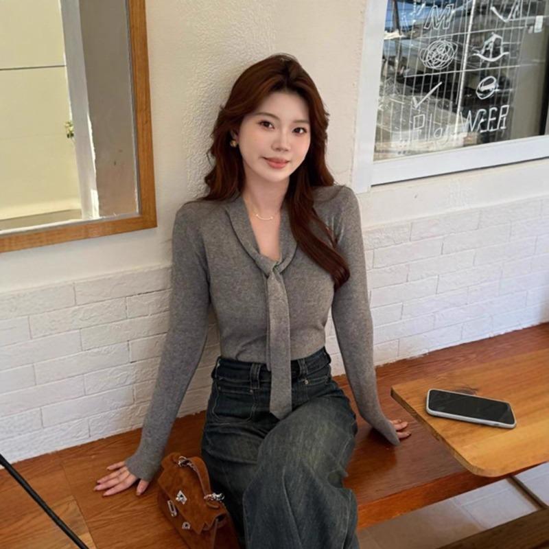 Early autumn light ribbon neck knitted sweater women's new autumn and winter high-end design sense inner bottoming shirt top
