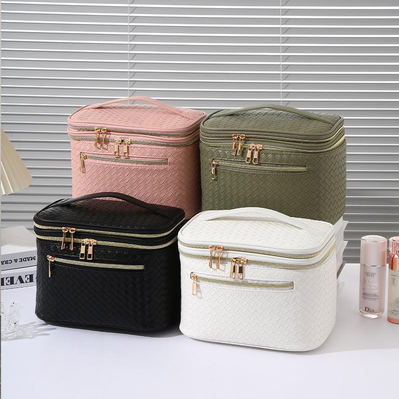 Flerfärgad dubbellagers PU-reseorganisatör för smycken och smink med vävd textur