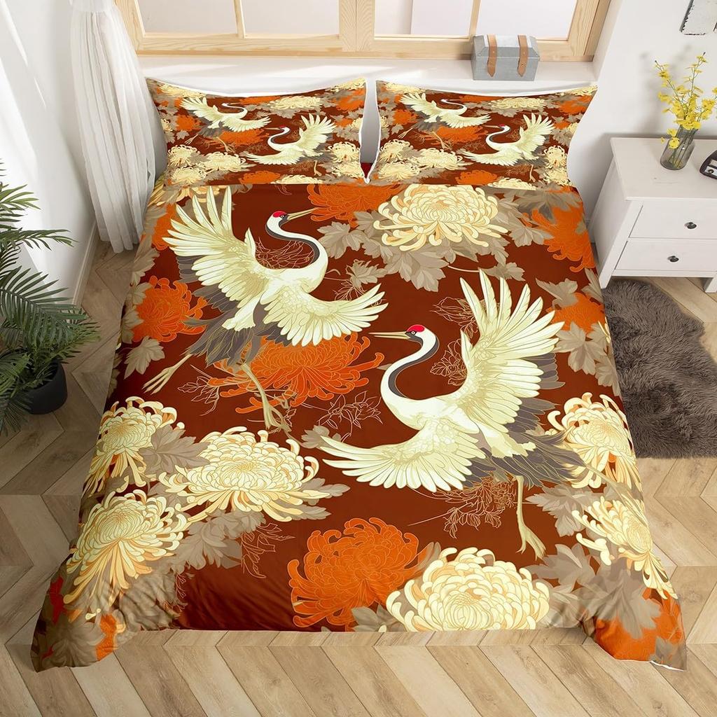 Crane Duvet Cover Twin King Traditional Chinese Style Painting Quilt Cover Chrysanthemum Flower Floral Bedding Set For Dorm Room