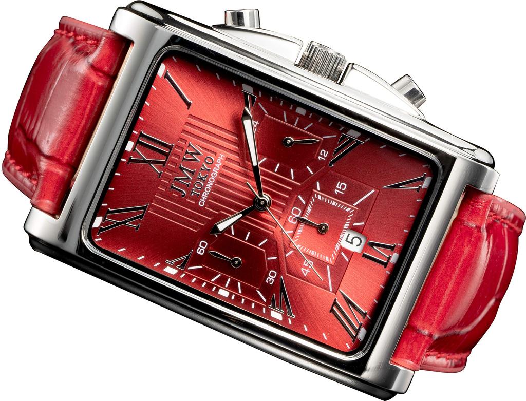 [Carefully crafted Japanese movement] This time, we are introducing a "rectangular" chronograph from the "JMW (Japan Movement Watch)" brand, which specializes in Japanese-made movements, featuring a deep red dial, a silver case, Roman numeral indexes, and other accents, and a curved case.