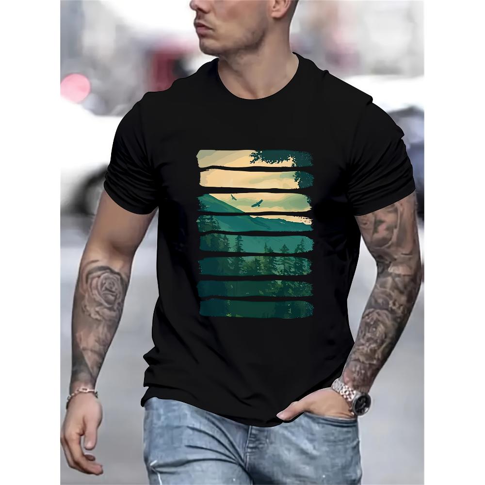 Layered Mountain Landscape T-Shirt,Soft Breathable & Fade-Resistant, Classic Fit for Daily Casual Wear