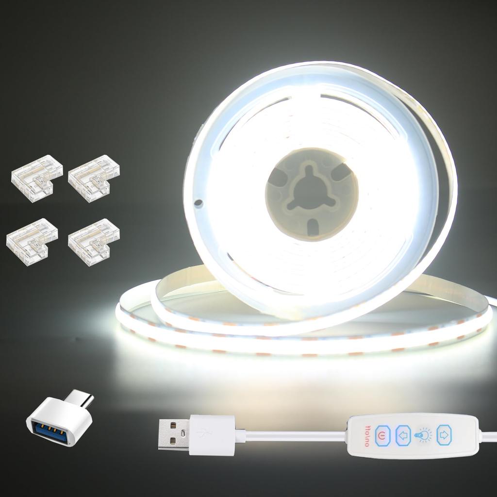 FCOB LED Strip Light, COB LED Strip, USB 5V, 320 LEDsm, Dimmer Switch, 10 Levels of Dimming, Adjustable, High Brightness, Double-Sided Tape