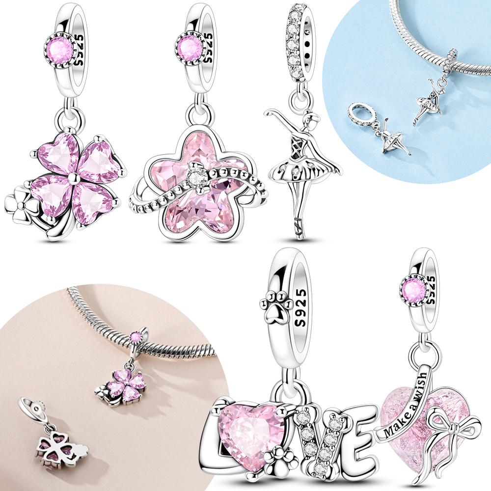 Original Copper Pink Love Dog Ballet Girl Star Four-Leaf Clover Bead Fit Women Bracelet Diy Valentine Gift Jewelry