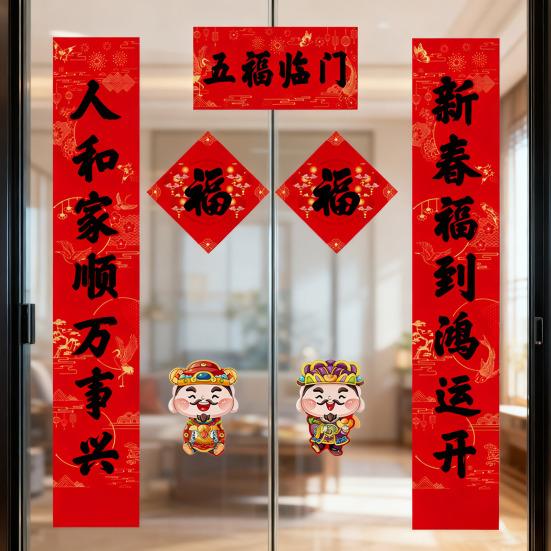 Detta allt-i-ett-paket innehåller verspar, välsignelseord, klistermärken med guden för rikedom, fönstergaller och röda kuvert—perfekt för att smycka dörrar, väggar, kylskåp och mer utan behov av klippning.