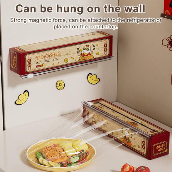 Stylish and Festive Design: Featuring a vibrant red and golden color scheme with an adorable cat pattern, this cling film box adds a charming Chinese-inspired aesthetic to your kitchen. It doubles as a decorative fridge accessory, brightening your cooking space while keeping essentials within reach.