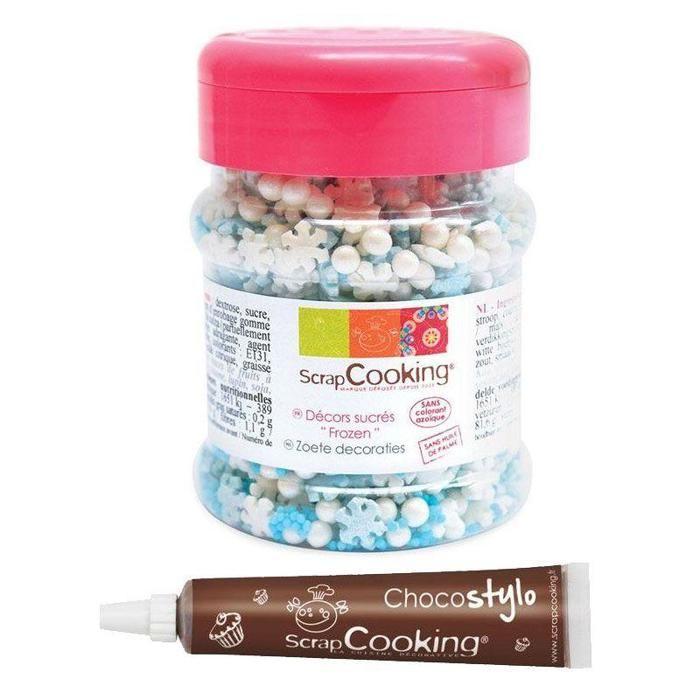 Décorations en sucre la Reine des Neiges.ScrapCooking® propose des décors sucrés dans un pot refermable pour embellir vos gâteaux, biscuits, cupcakes… Ces décors sucrés Mix Frozen sont sans huile de palme et sans colorant azoïque.Il seront parfaits pour un thème Reine des Neiges !Pot de 150 g.Ingrédients : dextrose, sucre, farine de riz; sirop de glucose, agent d'enrobage (gomme laque cire d abeille blanche), amidon (de blé / maïs), huile de colza (partiellement hydrogéné), épaississant : gomme adragante, colorants : E131, E133, E171, El 72, sel, arôme, acide citrique, graisse végétale (coco).Peut contenir des traces de fruits à coque, gluten, œufs, lait, graines de sésame, lupin, soja, poisson, arachides sulfites.Valeurs nutritionnelles moyennes pour 100 g / Valeur énergétique 1651 kJ — 389 kcal 7 matières grasses : 1,4 g - dont acides gras saturés : 0,2 g / glucides : 93 3 g - dont sucres : 81,6 g / fibres : g / protéines 0,3 g / sel : 0 g..Accompagné d'un stylo chocolat, hyper pratique pour dessiner ou écrire ce qui vous plaît sur vos pâtisseries et biscuits !Ingrédients : sucre, graisses végétales, pâte de noisette (14%), lait écrémé en poudre, cacao maigre en poudre.Emulsifiant : lécithine de soja.Extrait de vanille.Peut contenir des traces de fruits secs et dérivés.Poids net : 20 g. Le vendeur confirme que ses produits sont conformes à toutes les lois applicables et ne sont proposés que s'ils sont conformes aux politiques de Joom et aux lois européennes sur la sécurité et la conformité des produits.