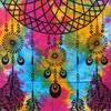 Graphic and balanced, the multicolored concentric rings open to a bright yellow center, with stylized feathers drifting below. Light blue vertical strokes add gentle movement, while intricate red-and-black borders and a deep outer frame give definition. On cotton, the surface feels natural and breathable; the high-contrast palette brings energy, yet the centered geometry introduces calm focus. It’s a strong focal point over a sofa, desk, or low console, sparking conversation or quiet contemplation alike.