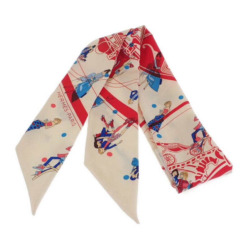 Production features:This is the Twilly Scarf Ex-Libris Les Parisiennes, a women's item from Hermes. This playful item features classic motifs and unique illustrations that reflect the sophisticated lifestyle of Parisians. The colorful design adds a touch of glamour to simple outfits. It can be used as a hair accessory, wrapped around the wrist, or tied to the handle of a bag, making it a versatile piece for a variety of outfits.