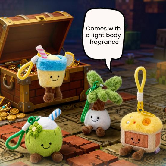 Inspirerad av uppfriskande inslag som kokosmjölk och palmer, framkallar dess mjuka leende och fräscha färgpalett en lugnande, somrig känsla. Finns i olika stilar som representerar drycker, växter och mat, är den perfekt för att skapa en personlig "sommarkollektion". Tillverkad av plyschigt, hudvänligt material, fungerar detta hänge även som ett härligt dekorativt föremål och en stressavlastande leksak.