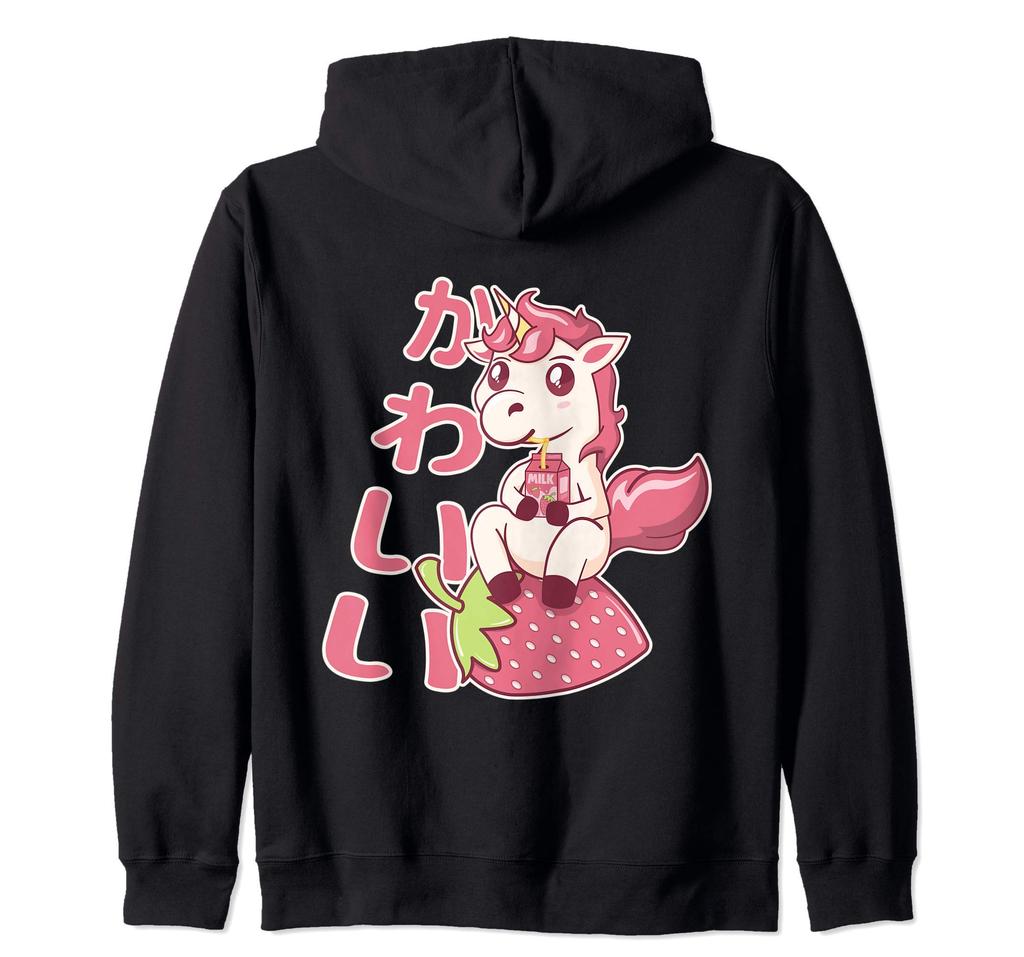 Kawaii Chibi Enhörning Jordgubbsmjölk Dragkedja Huvtröja