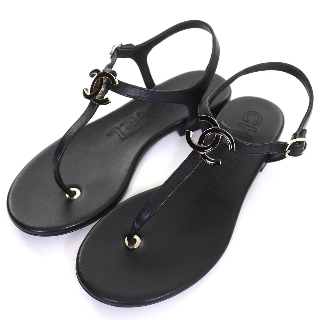 CHANEL Sandals COCO Mark ankle strap thong sandal flats black leather 24C G45428 Used