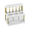 Denna avrinningsställs design med tre fack möjliggör enkel sortering och förvaring av köksredskap, vilket förbättrar köksorganisationen och effektiviteten.