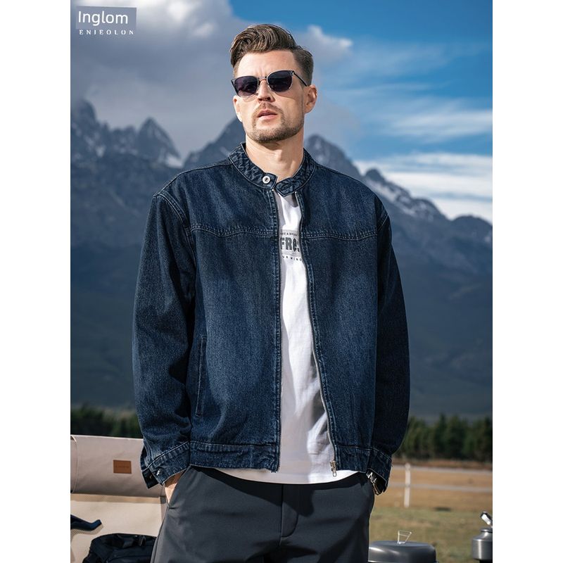 Yingjuelun Heavy-Duty Deconstructed Washed Vintage Denim Jacket for Men, Autumn and Winter Stand-Up Collar Jacket, American Retro Denim Clothing