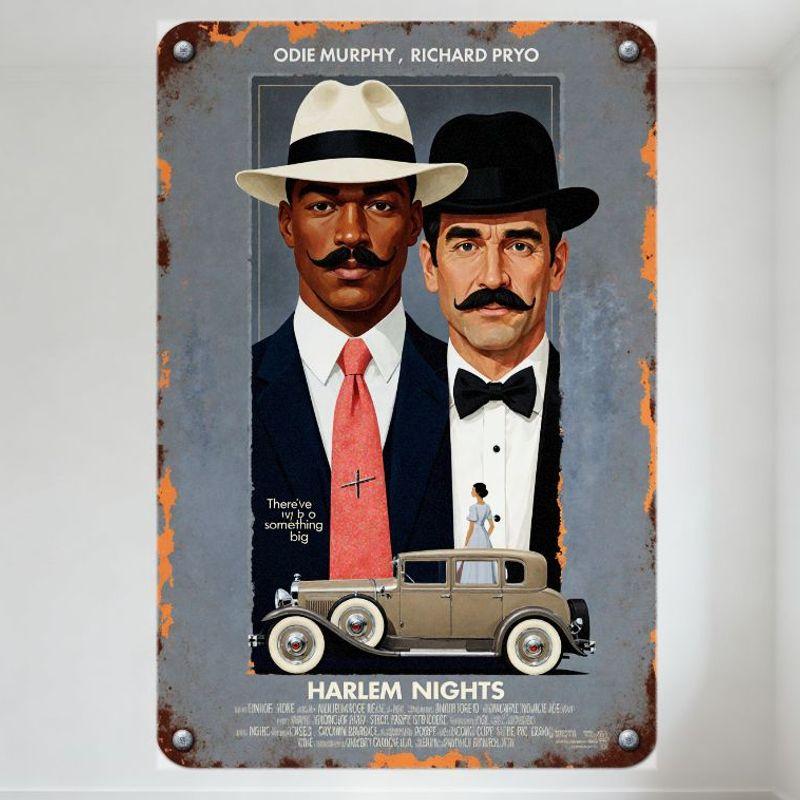 Vintage Harlem Nights Metal Tin Sign, Movie Poster Style Wall Decor with Stylized Men & Car, Rusty Texture for Man Cave Bar Café