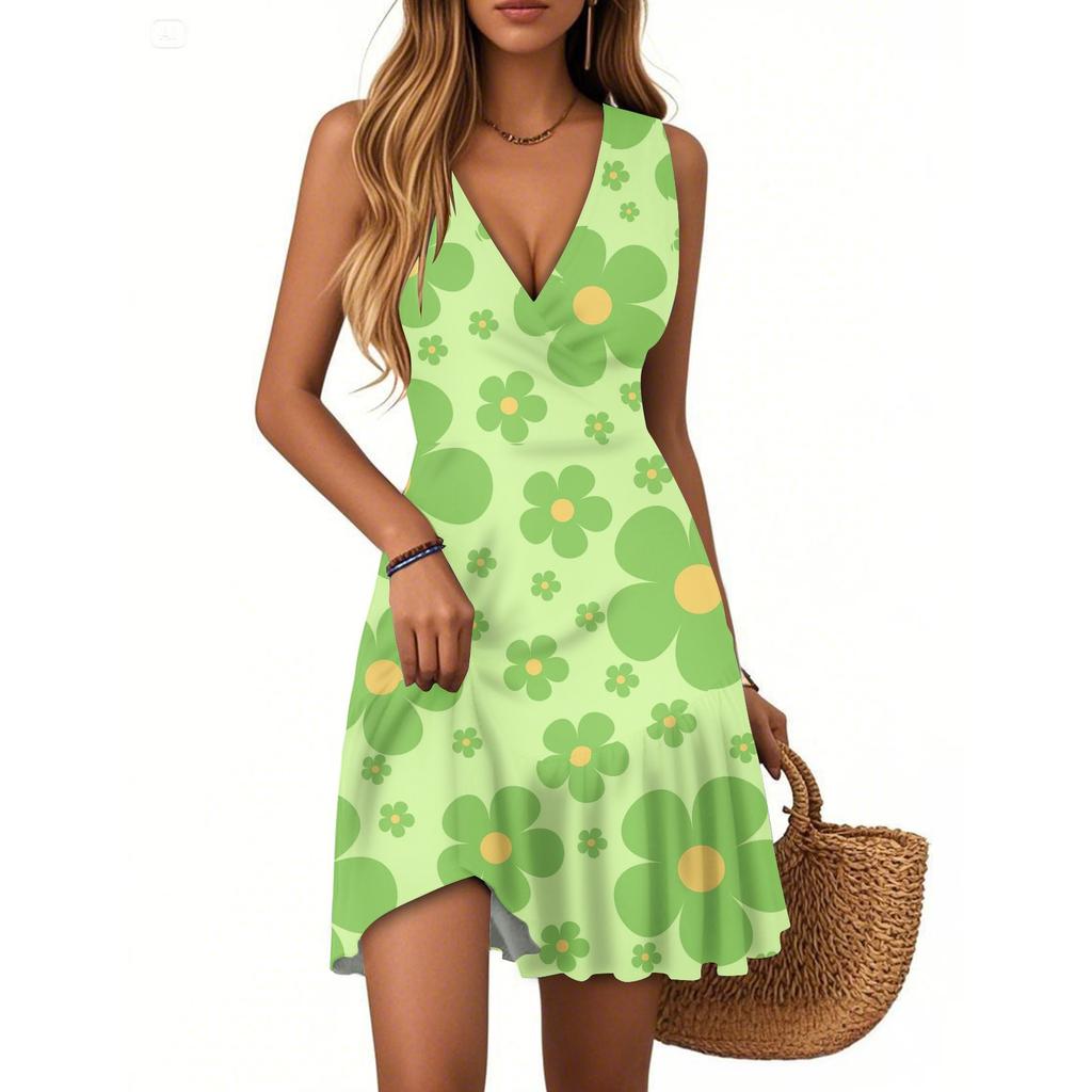 Dam Sommarklänning V-ringad Ärmlös Casual Blommig Tryck Fåll Plisserad Klänning