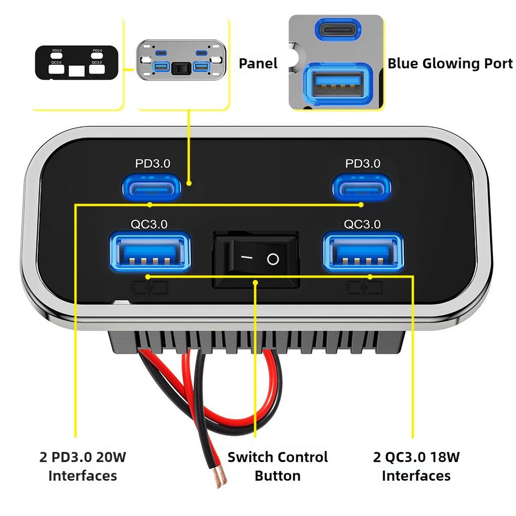 4-Port 24V RV Type-C USB Outlet QC3.0 USB-A & PD3.0 Quick Charge Socket Charger Panel for Car Boat ATV Motorcycle Bus Caravan