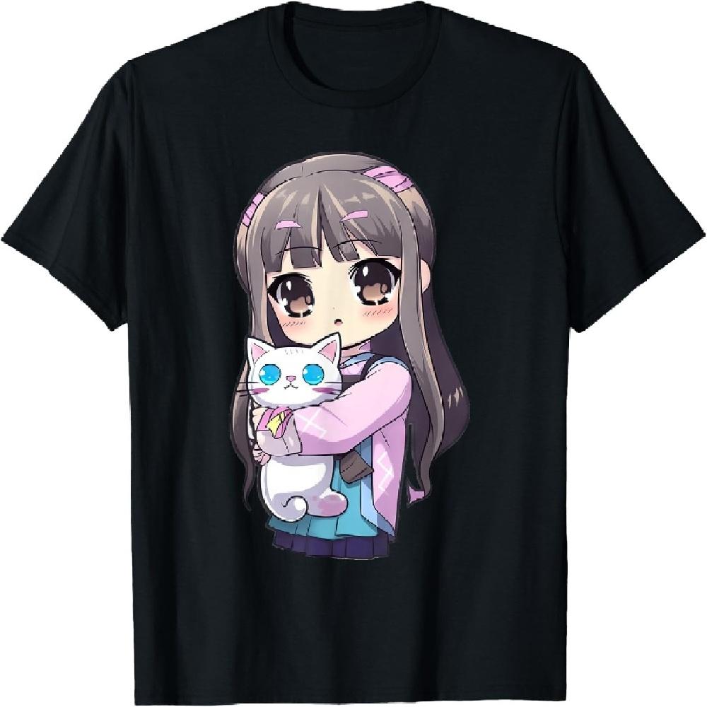 Anime and Cats Kawaii Cute Teen Otaku Girl with Cat T-Shirt