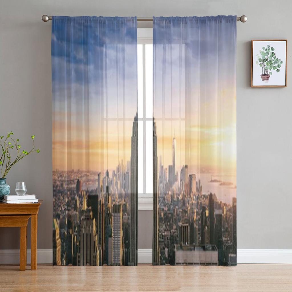New York City Skyline Med Urbana Skyskrapor Vid Solnedgång USA Skira Gardiner för Vardagsrum Sovrum Fönster Voiler Tyllgardin