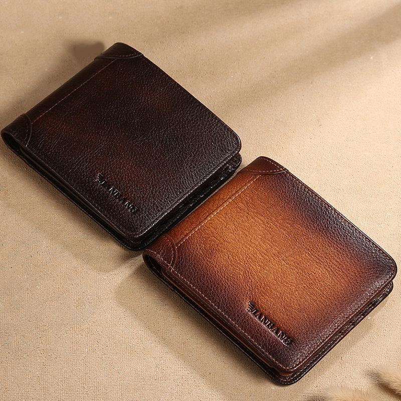 Men's RFID Blocking Genuine Leather Wallet Vintage Short Multi Function Large Capacity Cow Skin Purse Money Clip